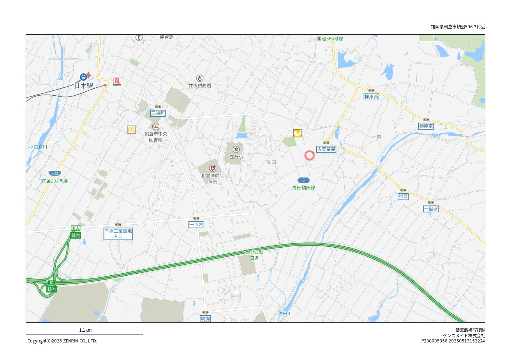 ※地図上の「対象地」は「〒838-0064 福岡県朝倉市頓田」の場所を指しています。実際の場所ではない場合がございます。詳しくはお問い合わせください。
