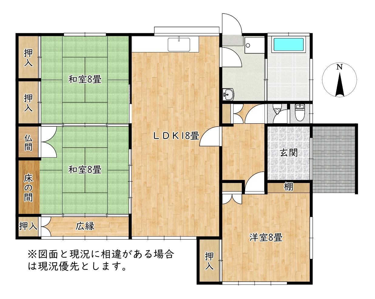 - 電気、プロパンガス、上水道、浄化槽、庭、駐車場3台分、[洗面所]